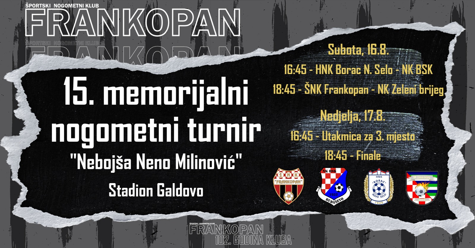 Turnir započinje 16. kolovoza, a prvi susret zakazan je za 16:45 sati između ekipa NK Borac Novo Selo i NK BSK Budaševo. Očekuje se borbena utakmica, s obzirom na to da obje ekipe poznate po svojoj čvrstini i taktičkoj pripremljenosti. Nakon njih, u 18:45 sati, na teren izlaze ŠNK Frankopan i NK Zeleni Brijeg. Ovaj dvoboj također privlači veliku pažnju, jer su obje momčadi poznate po velikoj želji za pobjedom pogotovo domaća momčad.